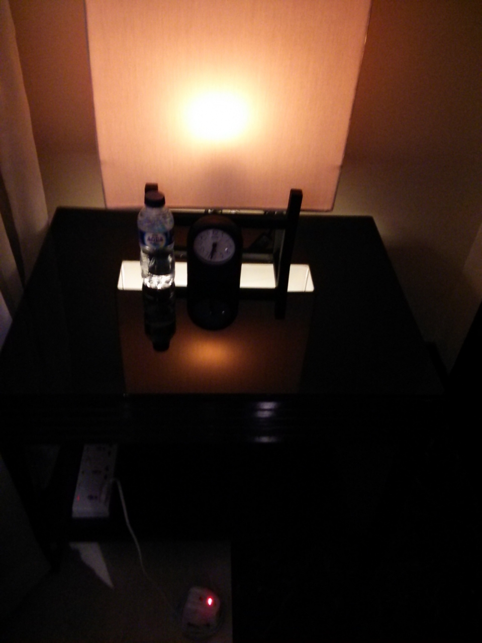 窓側のサイドデスクには目覚まし時計と電気蚊取り、4口コンセント(マルチプラグなのでAプラグOK。変圧はなし)、パソコン側サイドデスクには電話機(Panasonic)。