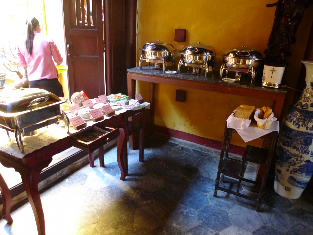 お世話をしてくれる女性スタッフがいるが、彼女も料理と一緒にやってきたのだろう。