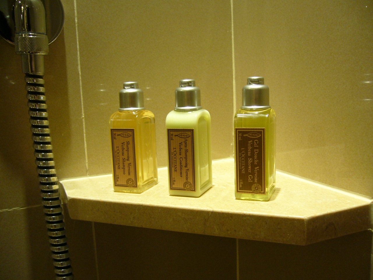 バスタブは深く、横たわるというより座って入る感じです。独立したシャワーブースあり。アメニティはロクシタンなのがうれしい。
