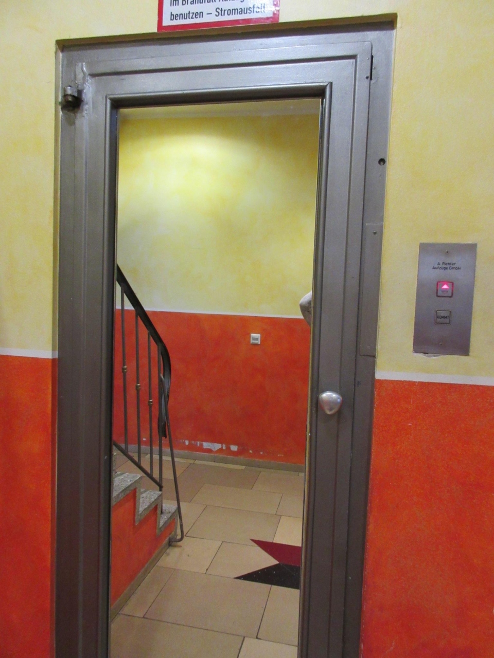 右手壁の呼びボタンを押し、リフトケージが来るまでは