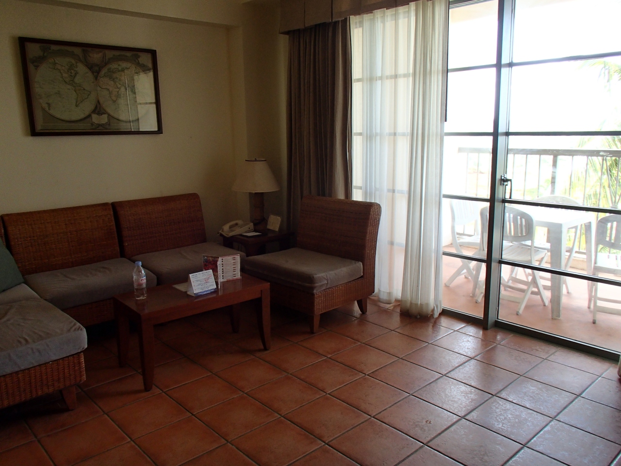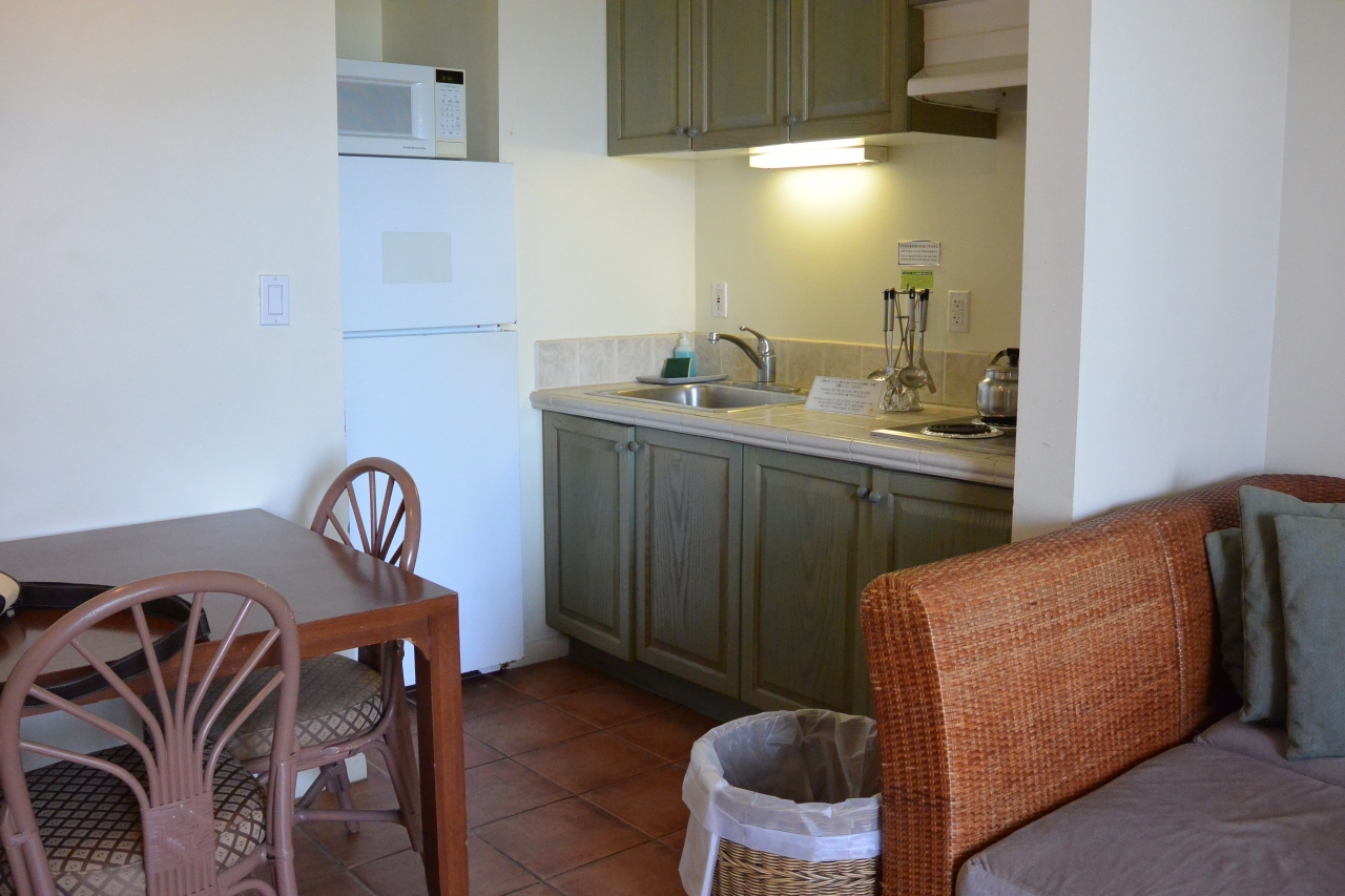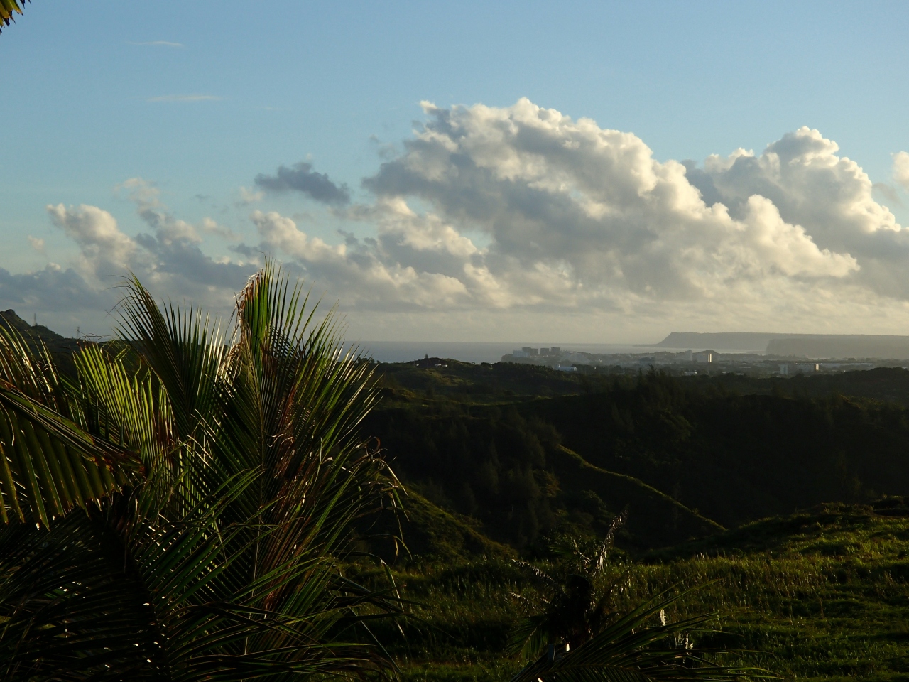 ベランダ側は、E棟の敷地が道路から一段盛り上がっているのと、そもそもレオパレスリゾート自体がマネンガンヒルとういう高台に位置していますが、その中でもラ・クエスタE棟は一番北側にあるので、北向きベランダはいわばリゾートの外周縁にあたり、遠くグアム空港やタモン湾、恋人岬まで見渡せました。タモン湾から車で3~40分かかるのに海が見える、これはなかなかナイスです。予期していなかっただけに嬉しかったです。