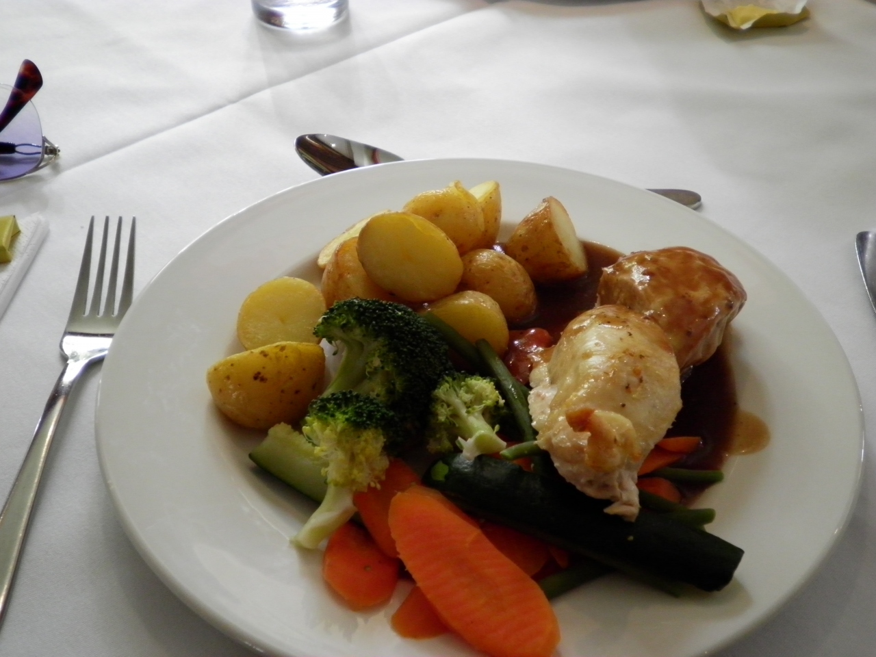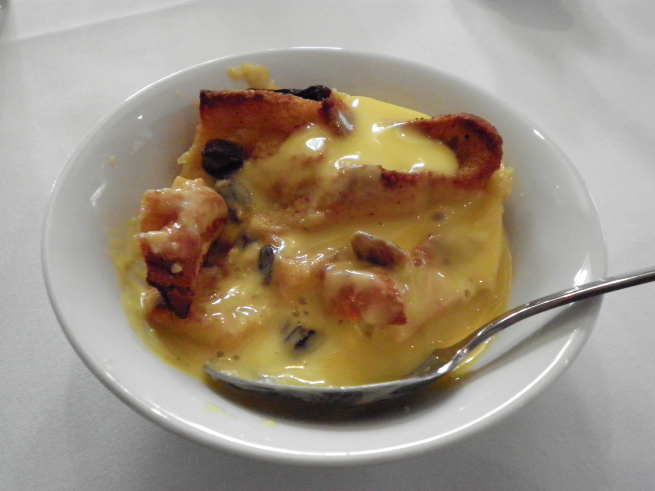 トマトスープ、チキンソテー温野菜添え、ブレッド&バタープディングを食べました。