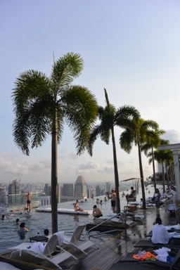 シンガポールに2010年に完成し、シンボルタワーになったマリーナベイサンズ。ホテルの規模も2500室以上と特大で、常に人が行き来している印象です。 57階のプールは遊泳用というより、観賞用ですし、パラソル等一切日よけになるものはないので、直射日光がきつい昼間は紫外線対策が必要です。