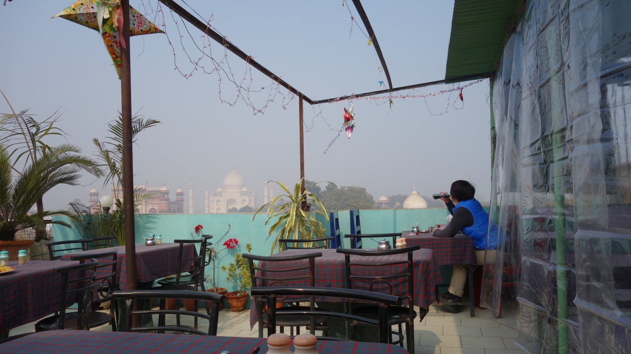 ランクとしては安宿に、属すると思います。臆せず中に入って行き階段を、ズンズン上がって行くとルーフトップに出ます。ソコは、レストランになっていて目の前にはタージマハルが丸見えです。オーダーしたのは、ビリヤニとチョーメン。ドチラも大変美味でした。