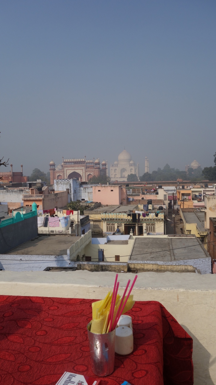 アグラに旅立つ前からタージマハルの見えるルーフトップレストランが、アル事は知っていました。お目当てのレストランに行くとソコより眺めの良さそうなルーフトップがアリ、食後のお茶はそちらに移動しました。それが、コチラのルーフトップレストランです。かなり眺めのヨイおすすめレストランです。