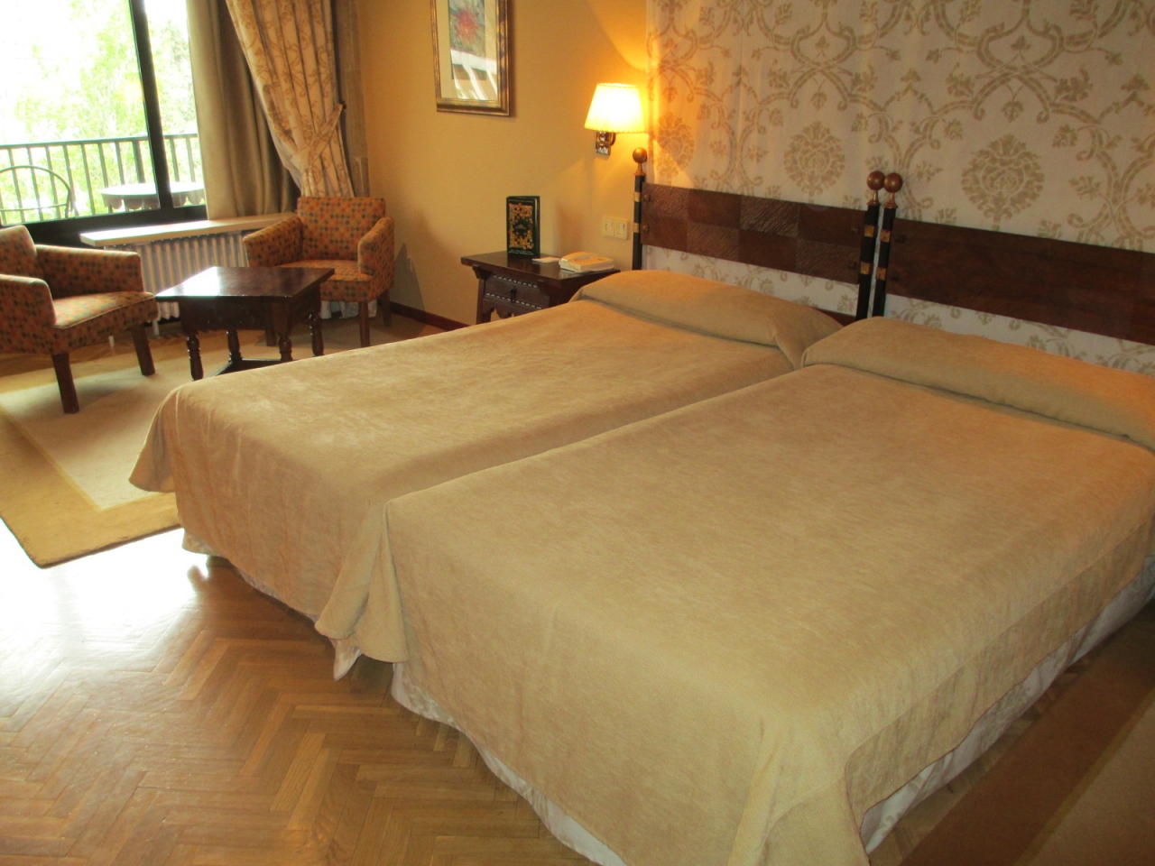 ホテルの前が大きな広場になっていて外観は、宮殿の様。内装は中世の姿がそのまま残り,高貴で優雅な雰囲気が味わえます。バスタブは広くパラドールのロゴのはいったアメニティもうれしく、広い室内はソファもあり優雅、ベランダもあり庭を眺めながらの一服は格別です。フリーの駐車料金はうれしい