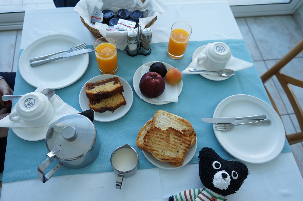 ・食パン3枚・パウンドケーキみたいなの2枚・目玉焼き&ベーコン(後で来た)オレンジジュース・コーヒーor紅茶(おかわり可)が一人分。写真にある果物は2人分。