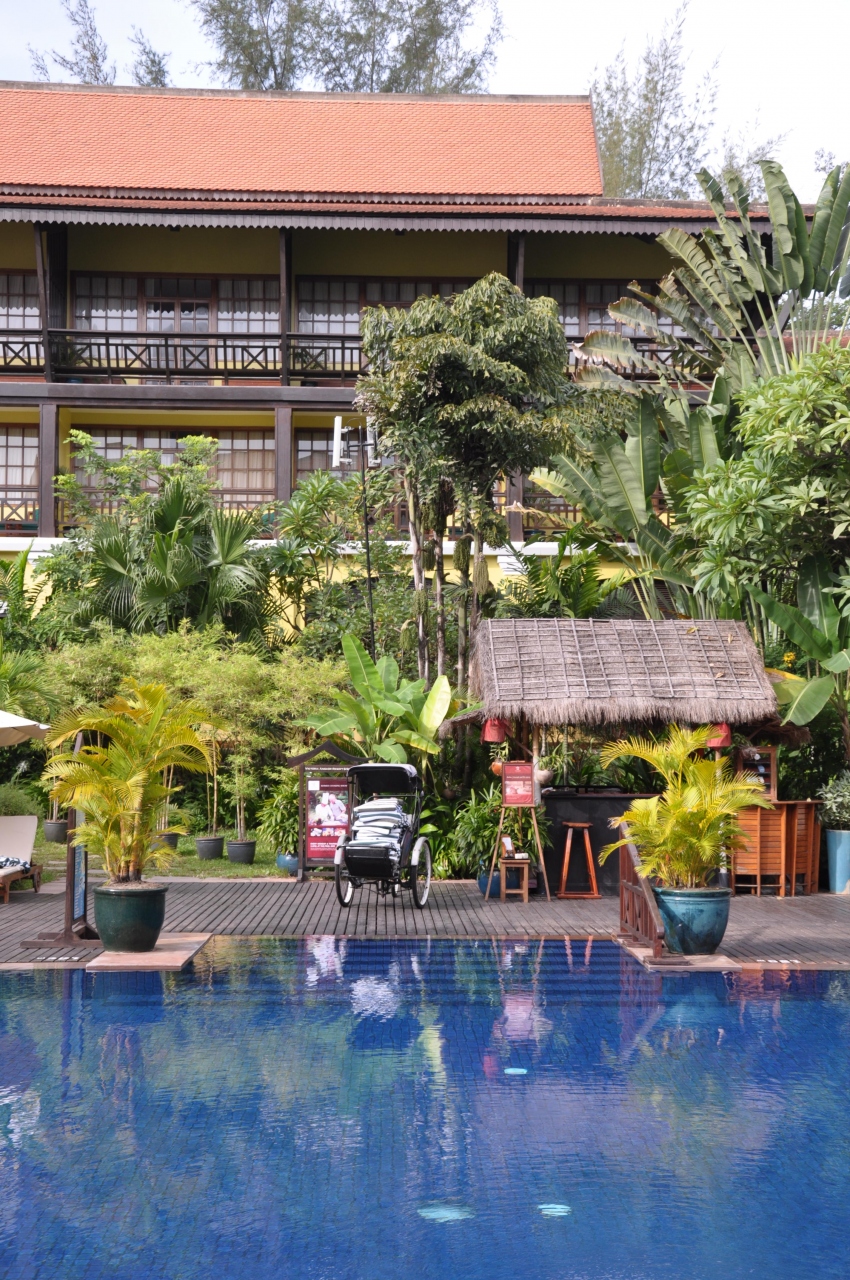 ホールの骨董的エレベーター(やや使いにくいが)、プールサイドのタオルを置いてある人力車等、天蓋付のプールサイドのベット等、おしゃれを感じさせられた。