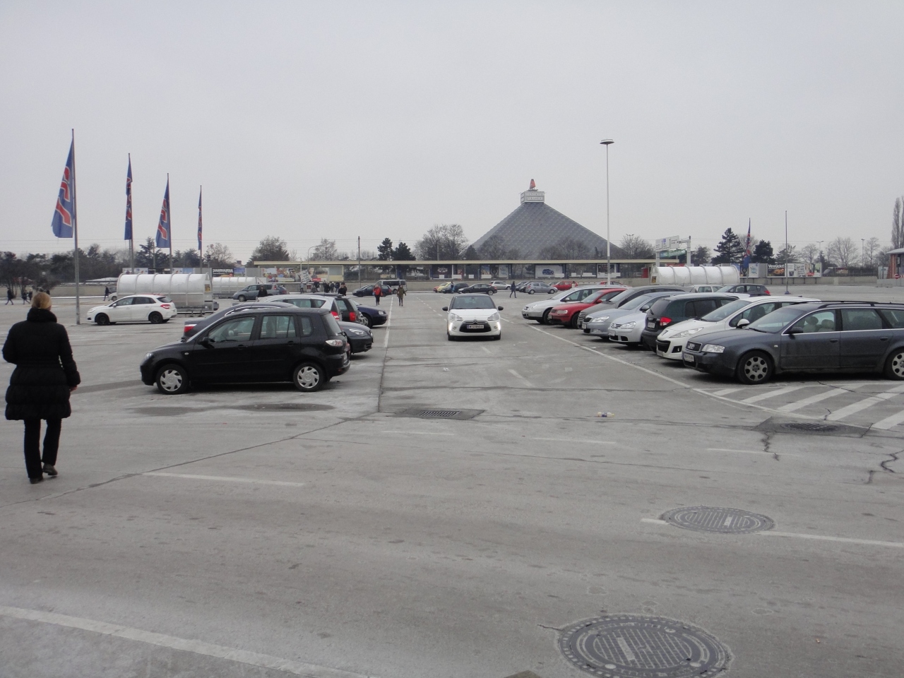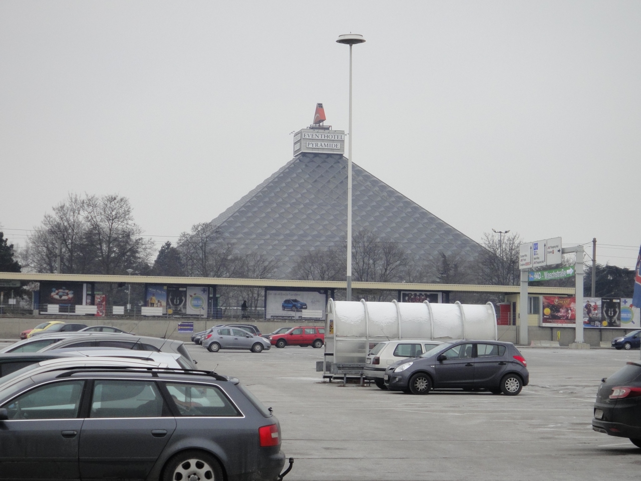 ホテルに近づくと、ガラス張りのピラミッドが見えてきます。ルーブル美術館の中庭みたいなものです。ホテルはいろいろな施設が併設されているため、敷地が広く、すぐ脇を走っている路面電車のバーデン線まで、庭をずんずん歩いて行きます。その道なりに案内表示がないので初めてだとわかりにくいと思います。Vosendorf Shopping City Sud(ショッピング・シティ・ズュート)駅は、敷地から地下道でアクセスできます。そのまま線路の向こう側に出ると巨大なショッピングセンターの駐車場で、端から端までは車で移動したいほど巨大です。