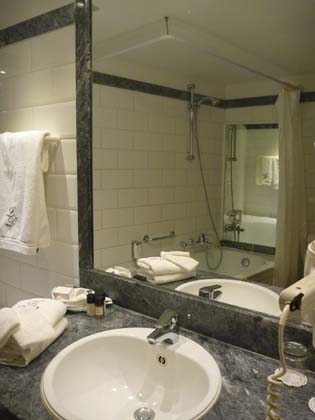 部屋もバスルームも割りと広め。壁に騙し絵を描いて奥行きを出しているようです。