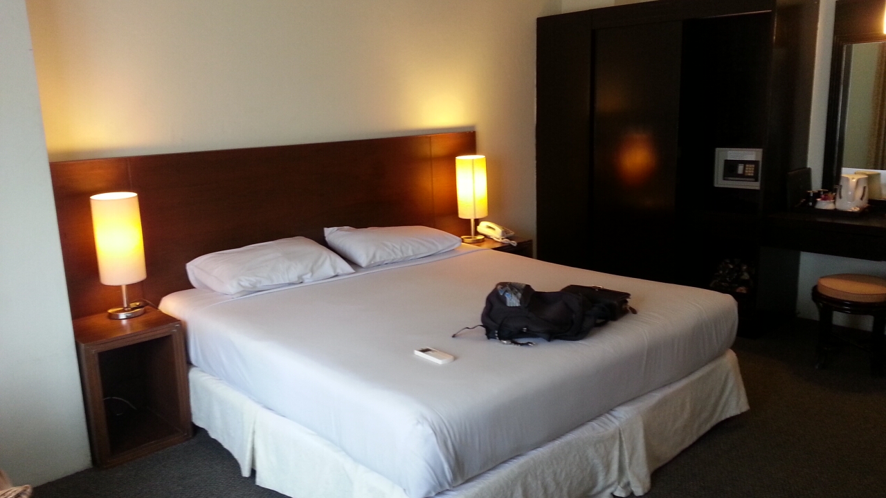 部屋は、ダブルベッドなので、一人では広すぎで、小さなエアコンではなかなか部屋が涼しくならない。照明もすくなく、ちょっとうす暗い感じ。