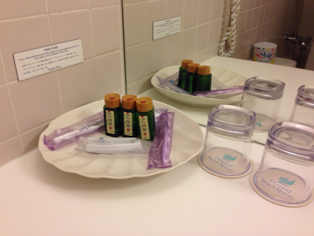 アメニティーは緑茶のシャンプー、コンディショナー、ボディーソープ、固形石鹸、歯磨きブラシ、コットンと綿棒のセット。歯磨き粉のにおいが私は苦手でした。