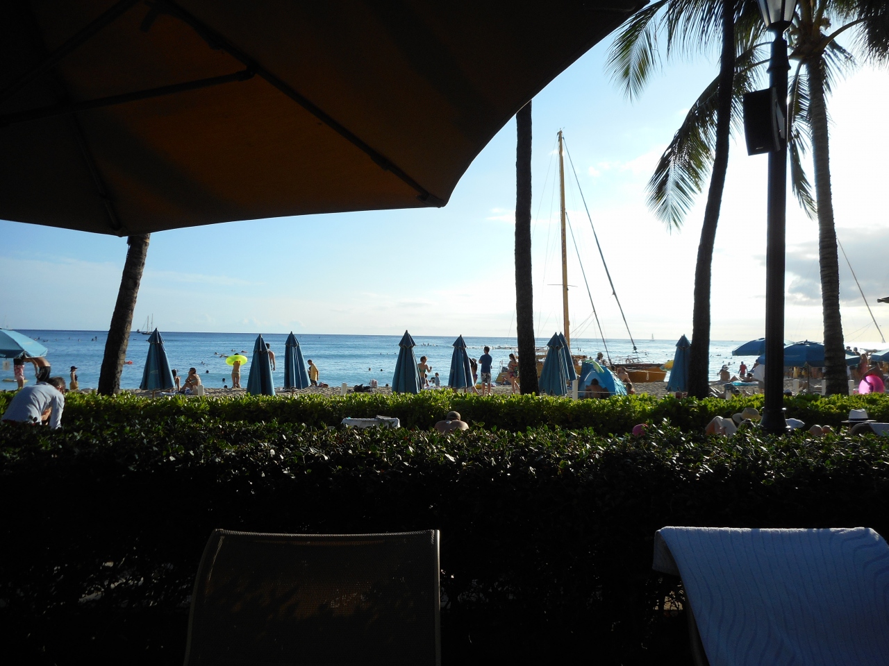 オーシャンビューのヒストリックウイング バニアンオーシャンクラブに宿泊した。アメリカ的な広い部屋になれている向きには少し狭く感じるかもしれないが、バスタブのない部屋でもシャワールームは快適でベッドルームもワイキキビーチ正面の立地のため窓から見える景色は至福の時を過ごせる。