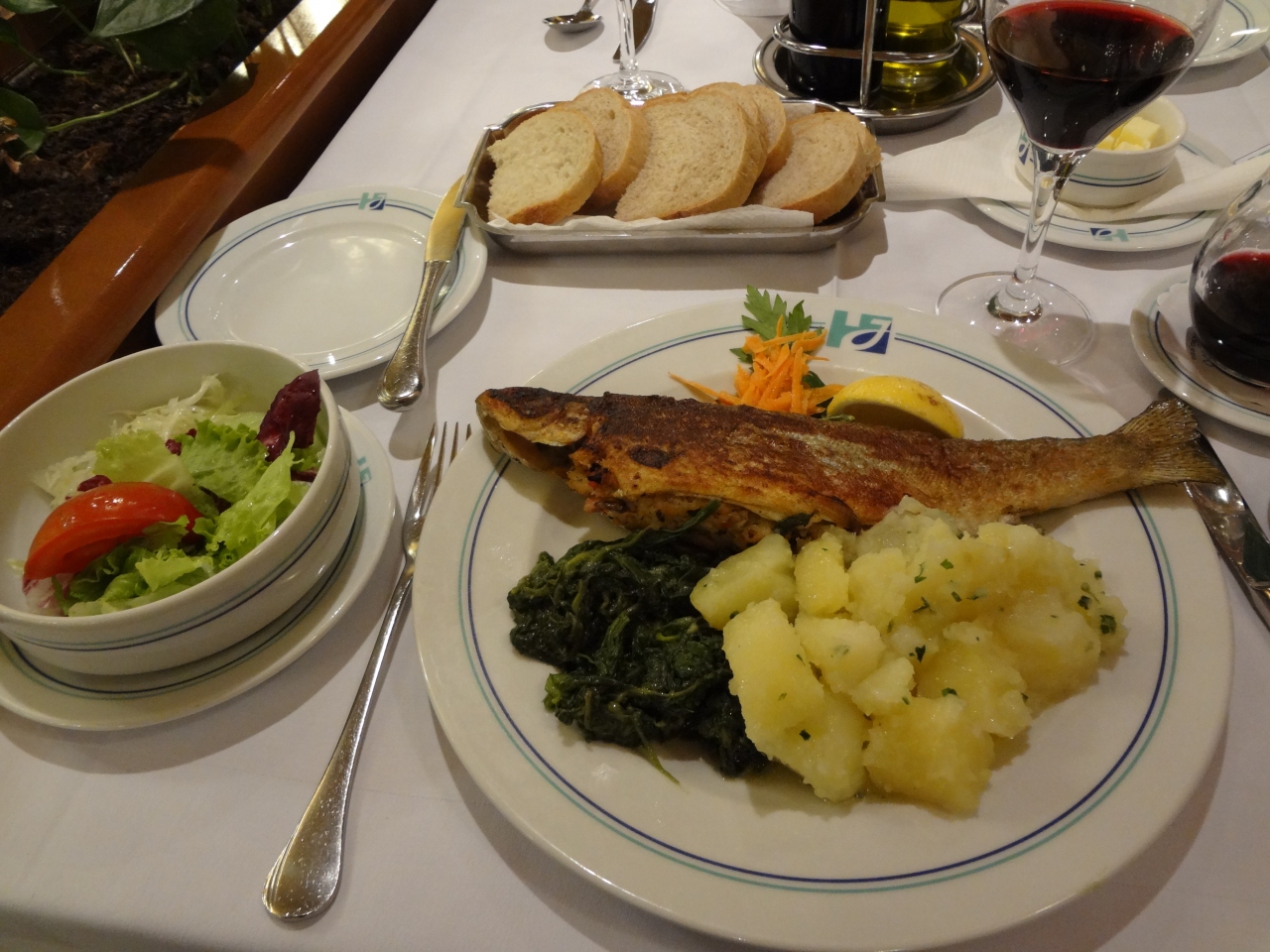 夜は地下1階の食堂のようなレストランで食事をしました。マスのグリルが美味しかったですね。支払いはその場かルームチャージかを選ぶことが出来ます。朝食は普通でした。