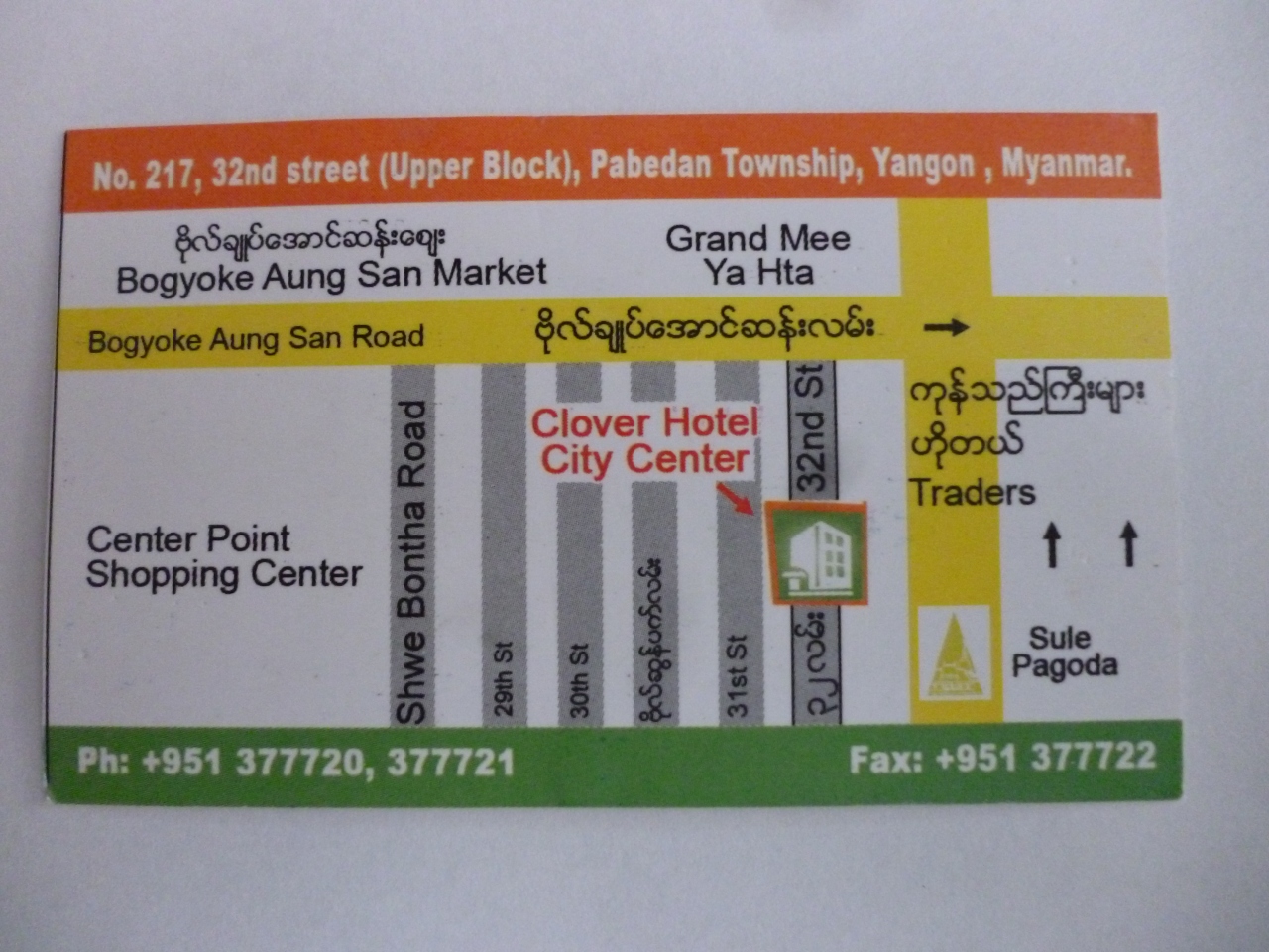 クローバーシティセンターホテルは、市内の中心部で、ミャンマ−人の誰もが知っているスーレーシャングリラ・ヤンゴン(旧トレ−ダ−ズホテル)の裏で、セントラルホテル横の道を100mほど入った所です。そのため、移動・ショッピングには便利な場所と、立地的には申し分ない。