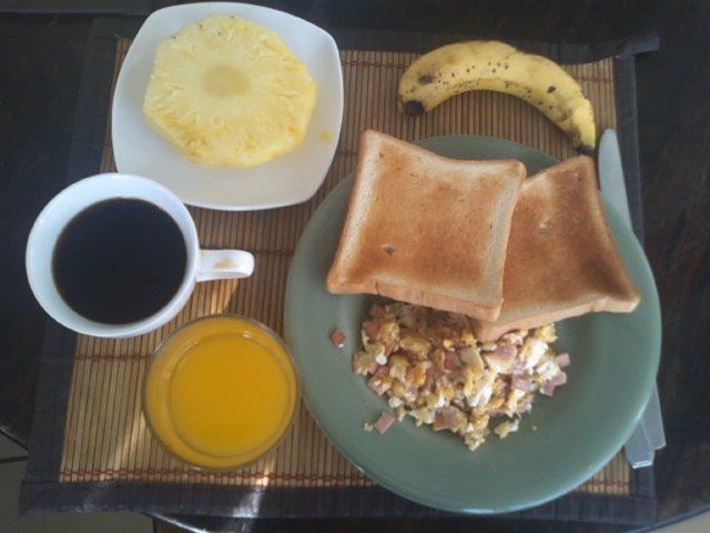 アラフエラはサンホセよりも空港に近いということで、翌日のフライトのことを考えてこの町に投宿することにしました。某ホテル予約サイトで、アラフエラの中で一番安い料金で出ていたのがこちらの宿で、ドミトリー1泊10USドル(税込で11.3USドル)というお値段だけでもお得感があるのですが、何とこれにかなりしっかりとした朝食が付いてくる(B&Bなので当然と言えばそれまでですが…)ので、とてもお得感がありました。また泊まりたい宿として一押しですが、予約サイトの地図が少し間違っていて、かなり迷ってしまったのは不覚でした。実は難しく考えなくても良くて、この宿はファン・サンタマリア公園のすぐ横(西側)にあり、宿からも公園を見ながら朝食を頂くことが出来ました。