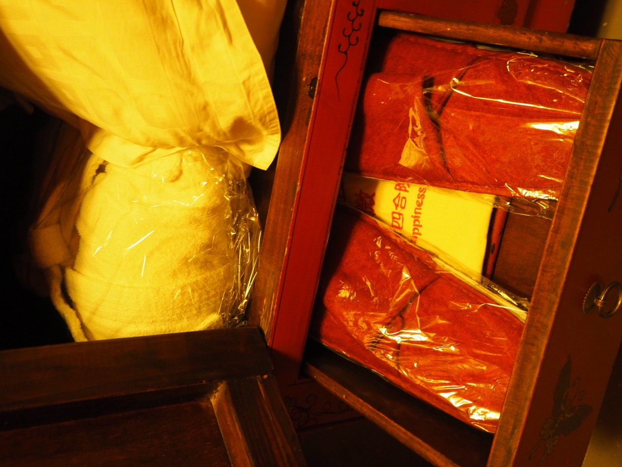 天蓋というか、押入れのようなところにベッドがあり、真っ赤な布で覆われ、目がチカチカしそうだが、夜は電気を消したので、全く気にならない。