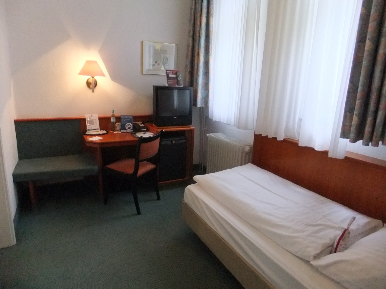 旧市街の木組みの家々に囲まれたホテルも魅力的でしたが、石畳の道を荷物を引いていくのが面倒な気がしたので、駅からすぐのこのホテルを選びました。部屋などきちんとしていて、よかったと思います。周りに色々なお店もあり、旧市街にも意外と近く、便利でした。朝食は15ユーロですが、ホテルの下に6時半から開いているベーカリーがあり、コーヒーなど飲めるので、ここで簡単にとりました。