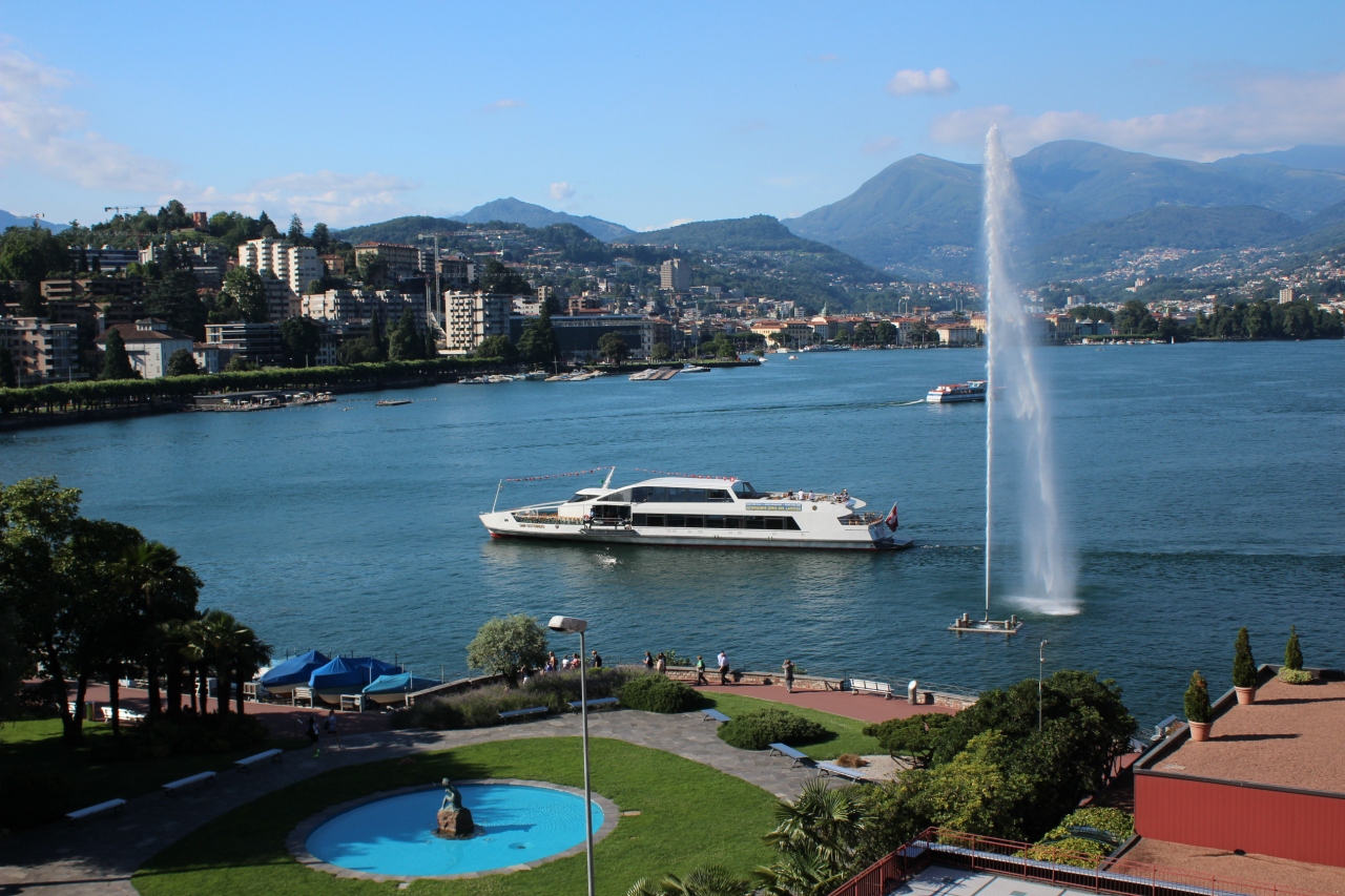 街の中心地から少し離れた位置にあるのでその分静かで落ち着いた雰囲気。昼食は部屋のベランダから湖の眺望を楽しみながらイタリヤのワインを飲みピザを摘まむ。誠に至福の時間!イタリヤ国境に近いせいか、話す言葉も看板もすべてイタリヤ語。そのせいか料理の美味しいこと、絶品! 夜は夜で湖面に浮かぶ島々の明かりがキラキラト輝き、ロマンチック・ムード。その景色をホテルのメイン・ダイニングルームから眺めながらいただくデイナーには一寸ばかりお洒落したい気分になります。かくしてルガーノの夜は更けるのです。