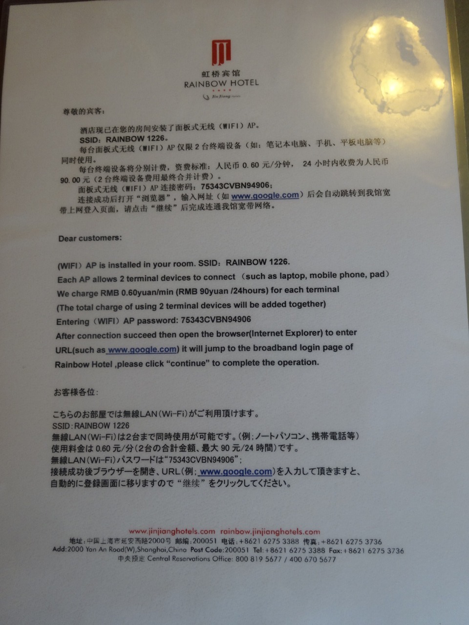 古くからあり、部屋が広い訳でも、特にこれという素晴らし点がある訳でもないが、日本人の痒いところに手が届く、日本風のサービス。 古北にあり、延安高架のとなりで、ホテル内にも日本料理店がありますし、付近にも数多くの日本料理店があり、出張者にはストレスを感じさせない立地です。