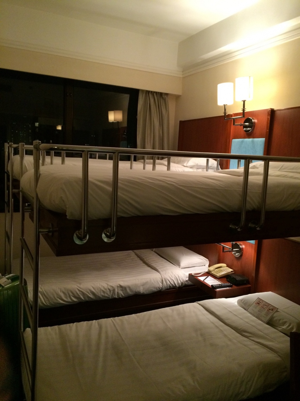 3人で3泊しました。狭いと聞いていたので覚悟はしてましたが、思った以上に狭かったです。2段ベッドだったので余計に圧迫感がありました。バスタブもありません。シャワーも可動式ではありません。しかし駅にも近いしマカオ行きのフェリー乗り場も近いし、ホテルの前にはコンビニとスーパーもあり便利なので寝るだけの人にはオススメします。Wi-Fiは4時間50香港$です。