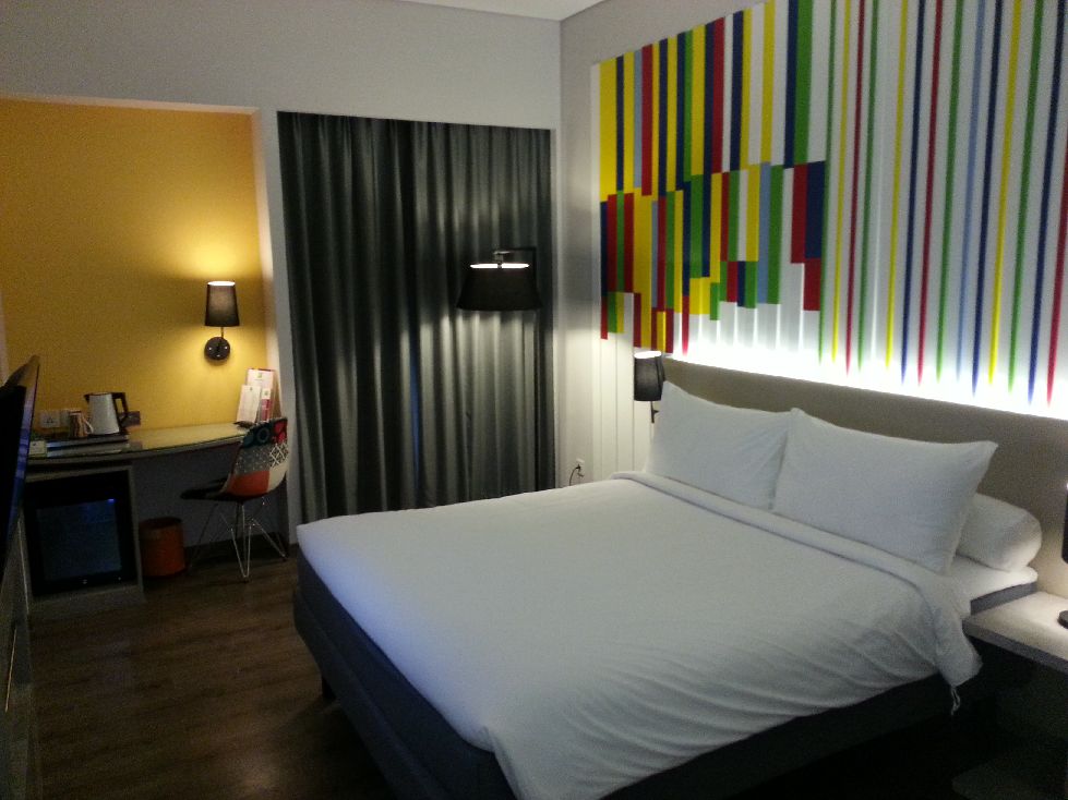 大きなショッピングセンターに隣接したホテルです。食事や買い物には便利です。ロビーは上層階にあって広く空間で奇抜な色合いの壁など若い方向けかもしれません。フロアは横長で奥の方の部屋だと結構歩きます。外の景色は見れません。部屋は狭いが綺麗です。