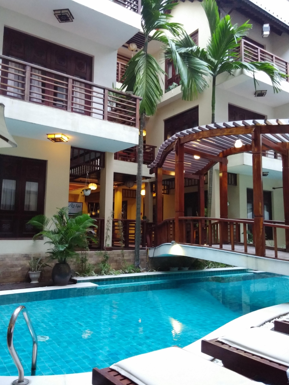 ホイアンは「小京都」という言葉がぴったりの、清楚で気品のある町で、当該ホテルは町家風のつくりの建物に、ヴィラ風のお部屋が並ぶリゾートホテル。川向うに広がる古い町並みはどこでも徒歩圏内。レストランはフォーマルなものは近くにはなさそうだったが、大衆食堂みたいなお店ならたくさんあり、それでどこも十分おいしく、立地条件はとても良い。