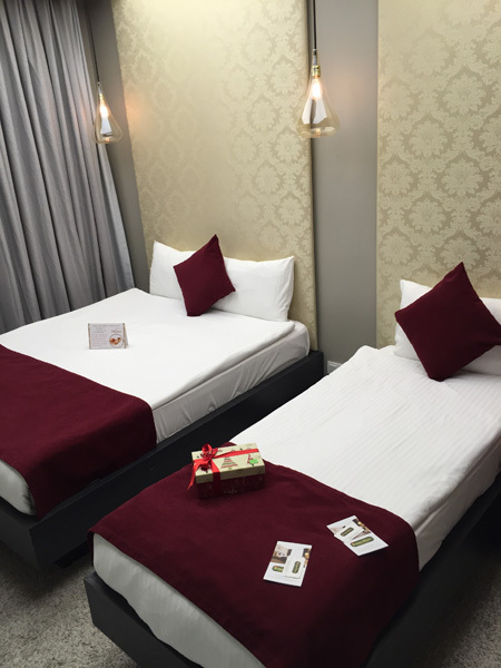 初日はスウィートにアップグレードされたので快適でしたが、2日目ツインを予約していたのにも関わらずなぜかダブルベッドの部屋に通されてしまいました。交渉すると、めちゃくちゃ小さいソファベッドを用意され1日だけつらい日を過ごしました。3日目にはスタンダードなツインルームに戻りました。毎日部屋を変えなければならないのは、都度パッキングしなければならず非常に億劫でした。