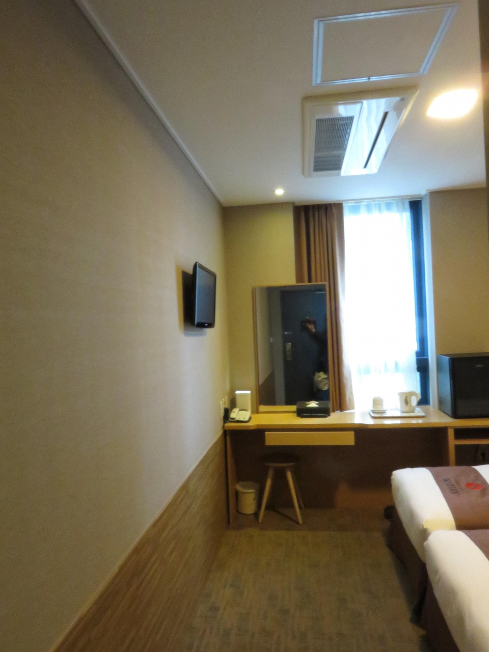 ベットで座りながらテレビを見て、ちょっと手を伸ばせば片手にビール、また手を伸ばせば荷物の整理もできる。窓なしの部屋だったら嫌だな~と思ってたけど、窓有りの部屋。ただ冬場は窓からの冷気が結構寒かったりする。微妙だな~と思ったところでした。