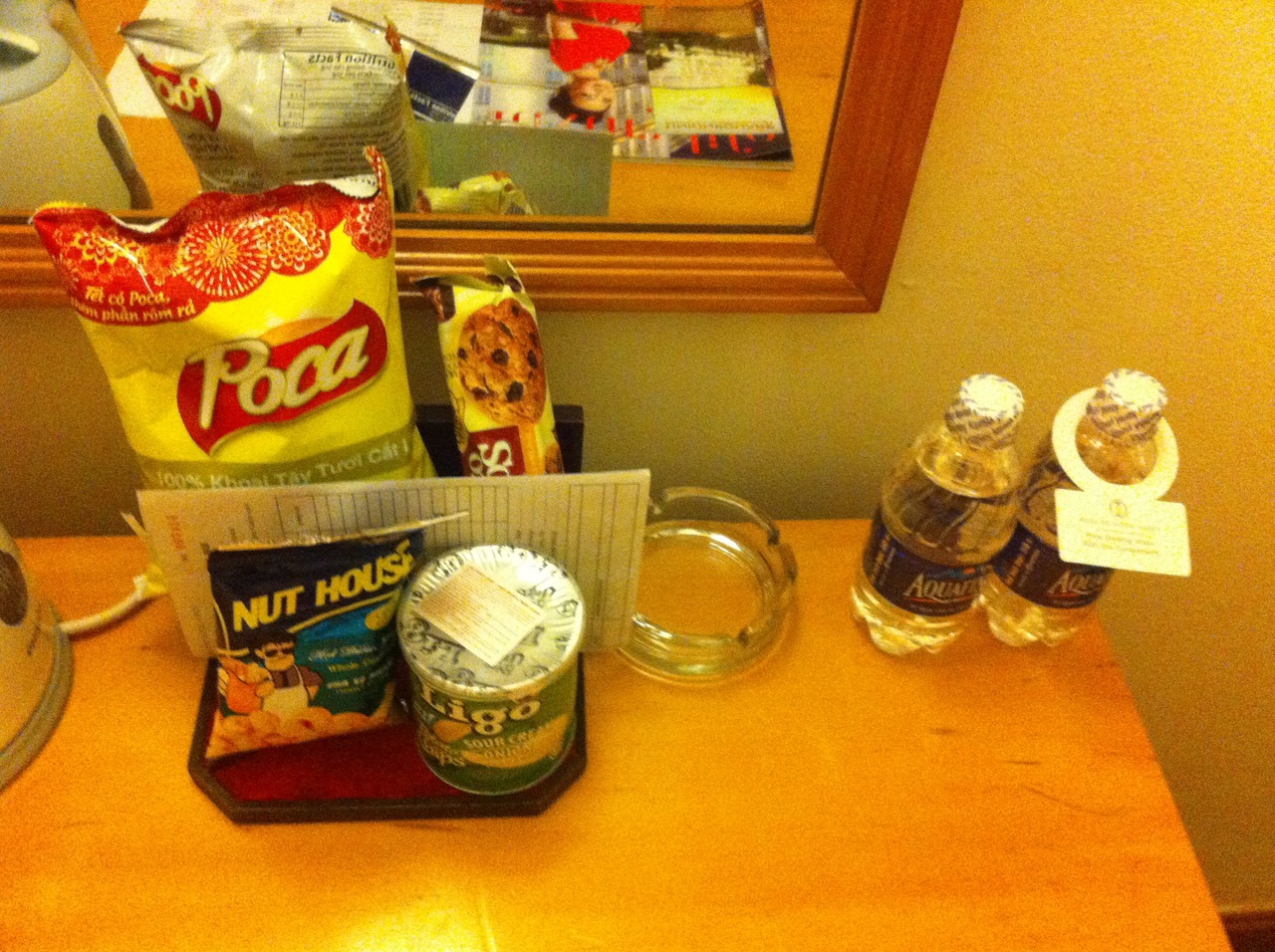 中に入っている飲み物等は有料、テーブルの上のお菓子も有料です。