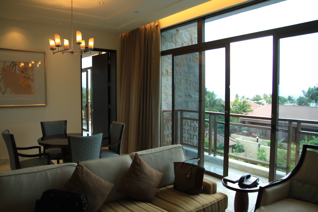 しかしながらホテルは立派です。ロビーも広く、全面に海が広がり圧巻です。夜には、歌とピアノが入りロマンチックです。部屋は海景套房とうい塔の一番端っこにある、スイートに泊まりましたが、100平米近くあり、角部屋なので、一方は海、他方はプールが見え、風が抜けるので、さわやかで非常に快適でした。また、バスルームからはプールが見えゆったりできます。食事は3,4か所ありますが、プール横の小さなフレンチが気に入っていました。ちょっと高いですが雰囲気も良く、味はなかなかです。特にフォアグラは絶品です。プールは2か所ありますが、一方のプールは冷たくて誰もいませんでした。