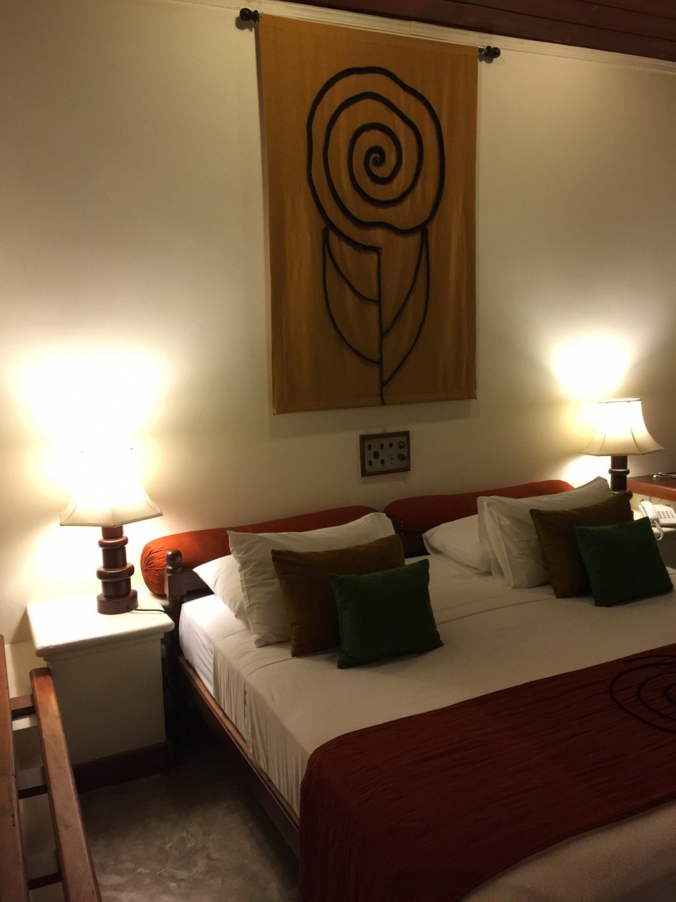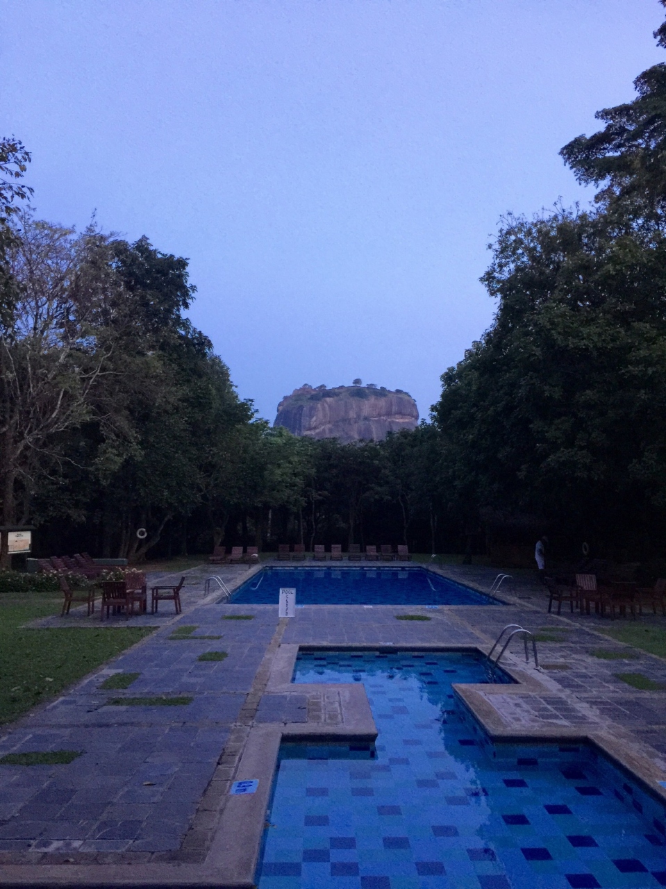コロンボから車で4時間半は少々キツかったのですが、とても静かなホテルでした。朝食はスリランカカレーがメインでしたが、ミルクティーも美味しくいただけました。プールからシギリヤロックが眺められて、最高でした。