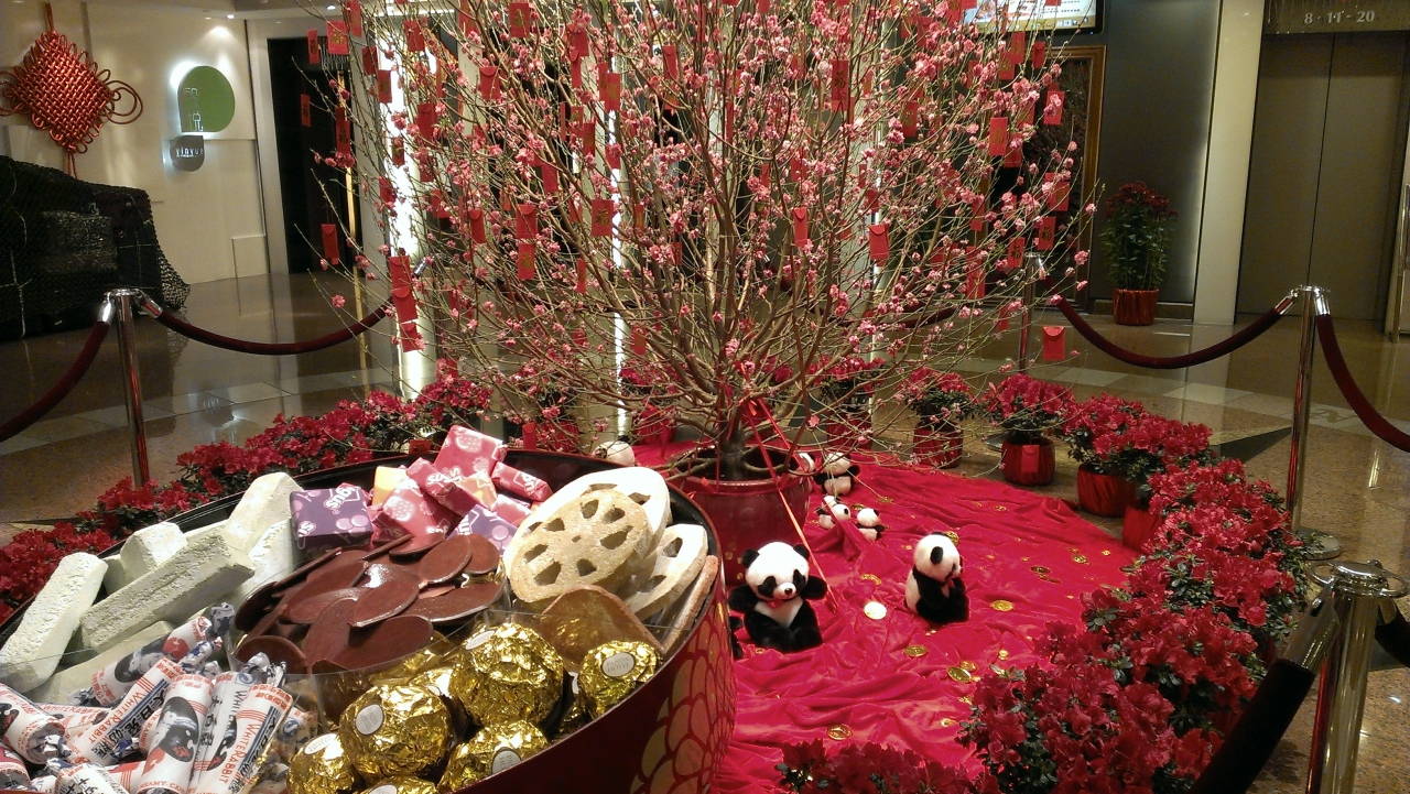 ロビーには「香港の家庭では春節にこのようなお菓子を用意し、友人は親戚をお迎えします」と英語、中国語で書かれた表示が出され、巨大な円形の重箱っぽい入れ物にお菓子を入れたディスプレイが、パンダのぬいぐるみとともに飾られていました。