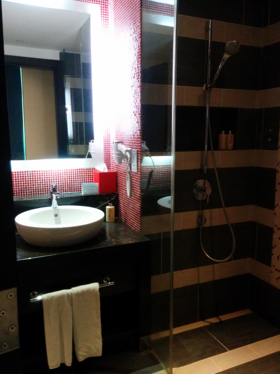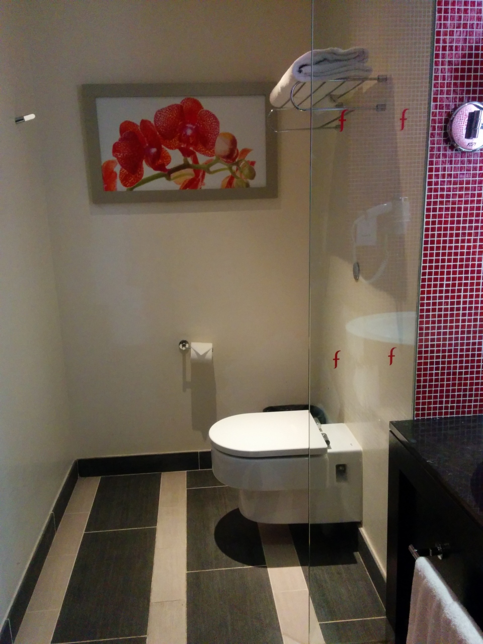 バスルームもオシャレですが、トイレのドアがない、バスタブがない、シャワールームのガラスのドアを閉めていても下からお湯がはみ出て来たりと、使い勝手はイマイチな感じ。