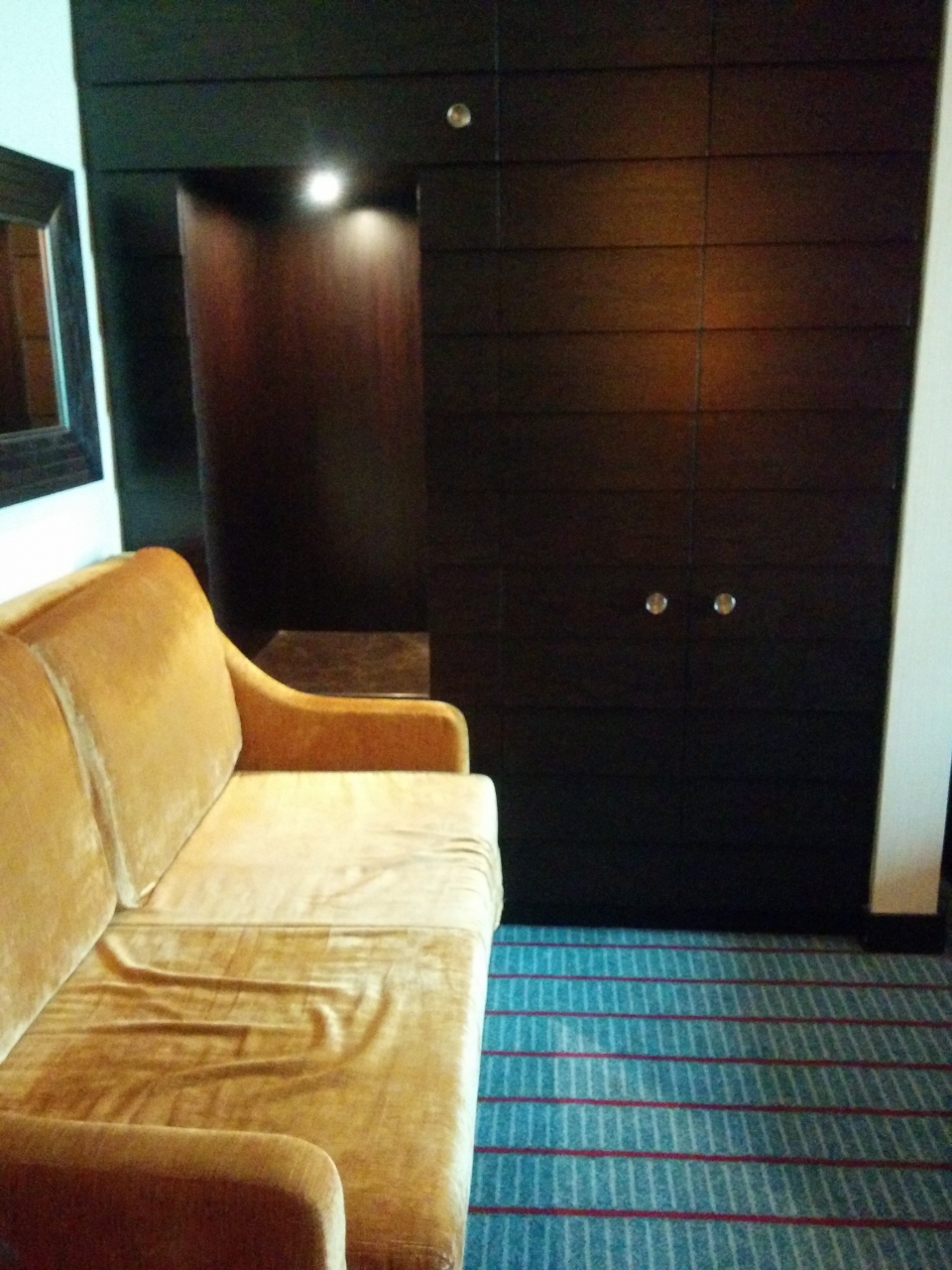 部屋の中は一見ビビッドなカラーの壁紙や蘭の絵などでオシャレに見えますが、家具などは安っぽい材質だったり、ソファーもくたびれた感じ。