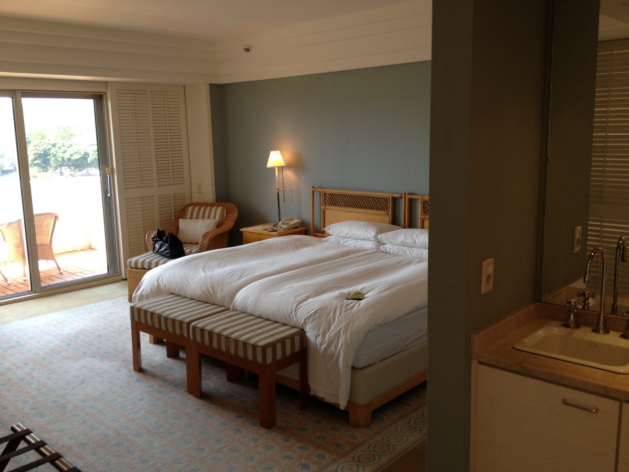 大人3人でコーナースイートに1泊しました。部屋からはゴルフ場が一望でき眺めは最高でした。部屋の中もスイートらしい内容で満足でした。但し中にあるカジノがそんなに盛り上がりがなく、あと免税店もロッテの方がいいのかなと思いました。ゆっくりするならこちらのホテルはいいでしょう。