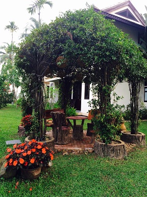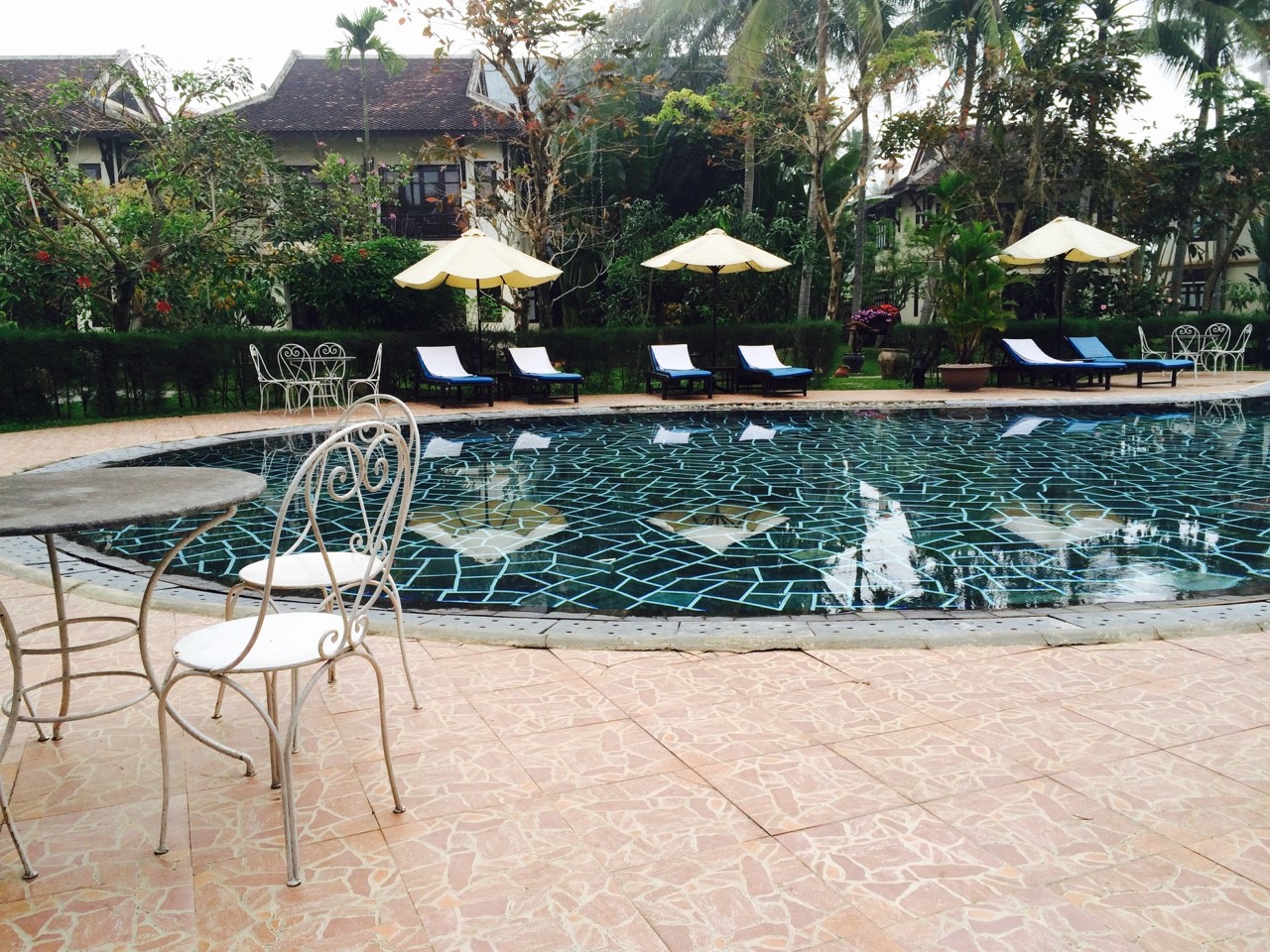 朝食は、庭からプールサイドを通って、川を眺めながら食べられます。
