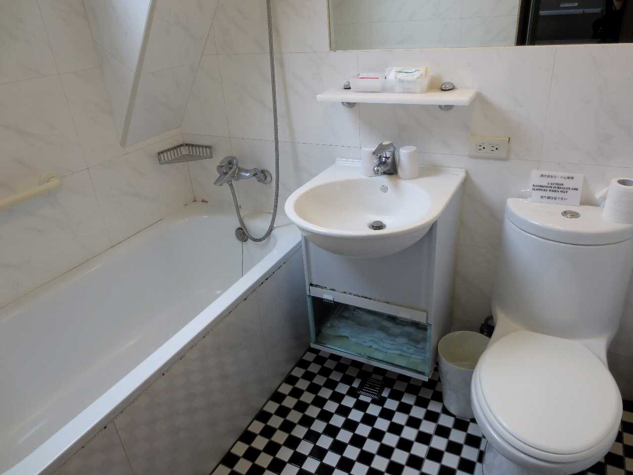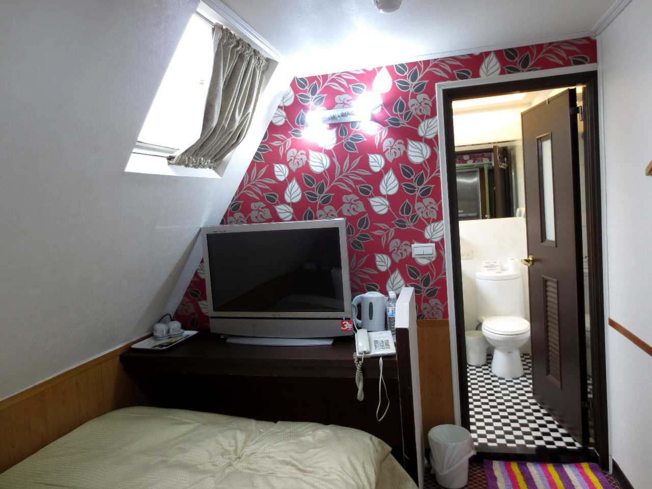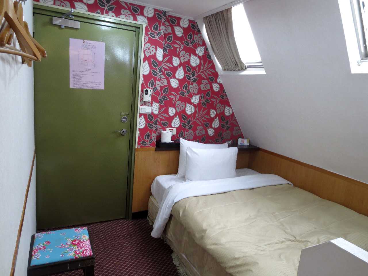 ホテルの建物は立方体の上部が斜めにカットされた形状なので、上層階は上に行くほどフロア面積が狭まり、最上階の10階はシングル部屋が4室配置されています。前回宿泊時は窓なし部屋の103に入りましたが、今回は窓有り部屋の102に入りました。窓有りと言っても天窓で開ける事は出来ませんが、朝の来たことがわかるだけでもありがたいです。シングル部屋の広さは日本の狭い格安ビジホ並みですが、バス・ルームは広くて浴槽付きです。しかし冷蔵庫はありません。スペース的には電子冷却式の小型の物なら置けると思うのですが、残念です。私的には夏場は当ホテルのシングル部屋は選択肢に入りません。当ホテルのホームページで各部屋の設備を見るとダブル部屋以上は冷蔵庫があるようですが、価格も上がって他のホテルと差がなくなります。