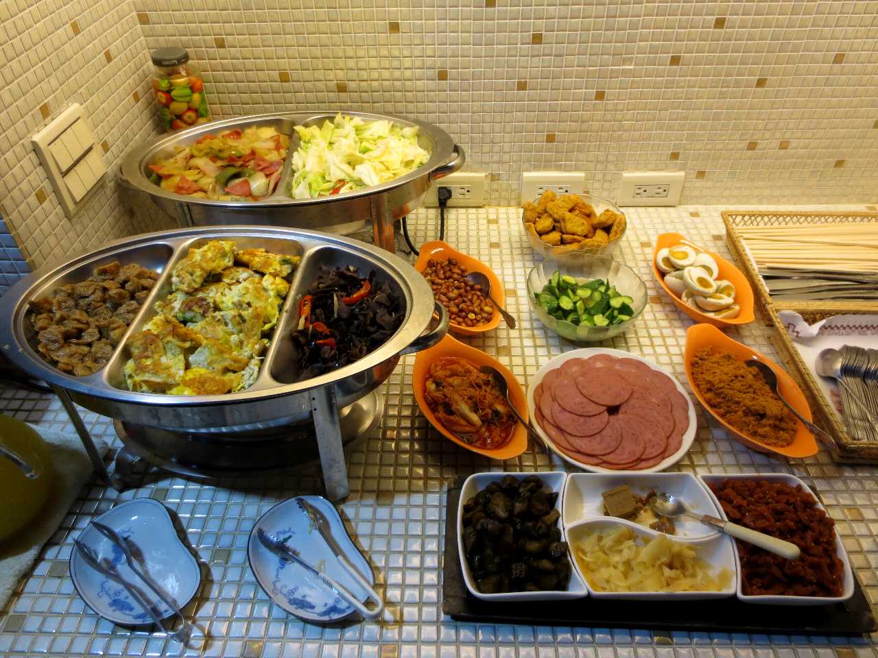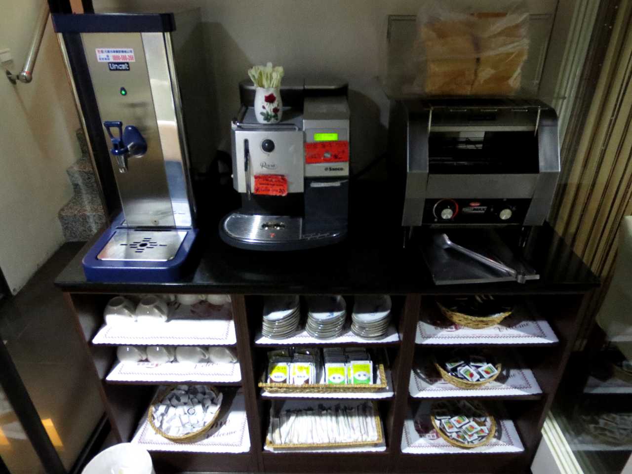 朝食は地下の食堂で頂きますが、オカズが五品でその中の三品は日替わりで変わるので、数日の滞在でも飽きずに頂けます。飲み物は、ドリップ・マシンでレギュラー珈琲が飲めるのもありがたいです。ただし、オカズを入れている金属容器は下からアルコール・ランプで温めてはいないので、時間が過ぎると冷えていきます。温かいオカズが食べたい人は、早起きして朝食の開始時刻に食堂へ行って下さい。