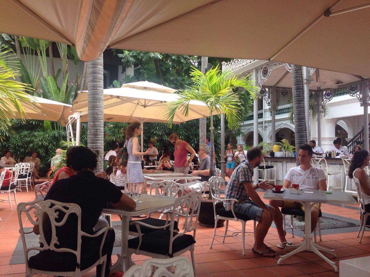 名高いラッフルズだけあって、ホテル内外の観光客がとても多いです。ホテルのメインの建物に入れるのは、宿泊客とハイティーを予約したい人のみのようです。入り口に警備員が複数人立っていて、ハイティー以外の時間にホテルへ入ろうとすると声をかけられます。