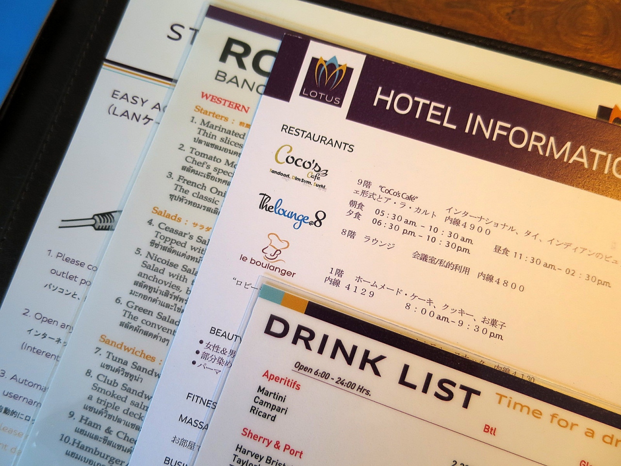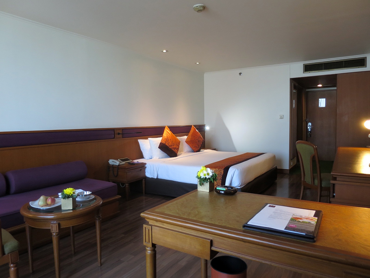 急速に進む円安の中、スクンビット界隈でのホテルに悩みましたが、前回利用時の印象が良く、費用対効果の高さを考えて「ホテルロータス・スクンビット」を選びました。宿泊料金はアコーアドバンテージプラス会員割引で1881THB++と、中級ホテル並みでした。さすがハードには年季を感じますが、館内は綺麗に保たれていますし、元々の造りが良いので、”古い”といよりも”味”と言ったものを感じさせてくれます。また広いロビーの中央に蓮の浮かぶ池があるなど、高級ホテルの雰囲気も感じられます。ホテルに到着し、レセプションに向かうと、すぐに美しい民族衣装を身に付けた女性ゲストリレーションスタッフが寄ってきて、ウェルカムドリンクをいただきながらチェックインとなります。この辺りも高級ホテルのサービスですね。客室フロアのうち11階以上は3か所で吹き抜けになっているのも、このホテルの特徴です。客室はデラックスルームにアサインされました。改装された客室はフローリングの床が気持ちよく、広さも充分です。大きな窓からの眺めは日本人駐在員も多く住む高級コンドミニアム街で、バンコクの持つ一面を目の当たりにすることができます。ホワイエ部分にマット代わりの人工芝が敷かれているのも特徴的ですね。またデスク上のディレクトリなどに日本語表記があり、日本人顧客の利用の多いホテルであることが分かります。さすが水回りの改装は難しためバスルームには古さを感じさせますが、さほど窮屈さはありませんし、何よりも温水洗浄便座の存在が嬉しいです。総合的に言えば、中級ホテルの料金で、高級ホテルのサービスが受けられるホテルだと思います。ちなみに、アコーホテルズが不定期に発表するスーパーセール期間では、かなり思い切ったプロモーション料金が出されることもありますので、そうした料金を利用できれば、費用対効果はマックスのレベルを超えると思います。