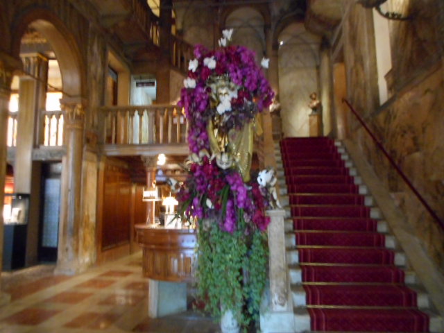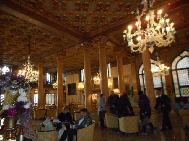 大運河、ゴンドラ乗り場の前にある、有名老舗ホテルの”ダニエリ”で、お茶しました。ホテル内は老舗らしく、雰囲気は重厚で歴史を感じます。お茶代もエクスペンシブ、でも、せっかく、久々にヴェネチアに来たのだからおのぼりさんよろしくお茶もしました。
