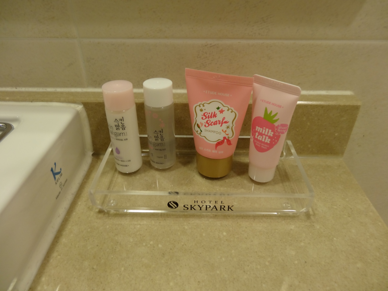 航空券とホテルがセットになったプランで2泊しました。最寄駅の「東大門歴史文化公園駅」6番出口からだと徒歩3分ほどですが、地下鉄5号線以外の2号線や4号線を使うと6番出口に着くまで駅構内を長々と歩き、6番出口は階段しかなかったので重い荷物を持ったときは注意が必要です。ホテルと、明洞やソウル駅間でスカイパークホテルの無料シャトルバスが出ているので、シャトルバスを利用する方が便利です。また、東大門のファッションビル群も徒歩圏内ですが、夜遅い時間まで、ロッテフィットイン前からホテルまでシャトルバスが出ているので利用すると便利です。予約等は必要なく、ホテルのフロントで時刻表の紙をもらえますので、時間通りに乗り場に行くだけです。部屋は狭いですが、2014年に出来たばかりといこともあり、全てが綺麗でした。アメニティはエチュードハウスのものが置かれていますが、コンディショナーはなく、他の韓国のホテルと同じように歯ブラシは置かれていません。ホテルのすぐ隣にコンビニがあり、道向かいにCJ FOODWORLDもあります。ユッケ通りやタッカンマリ通りにも歩いて行けるのが個人的にはよかったです。