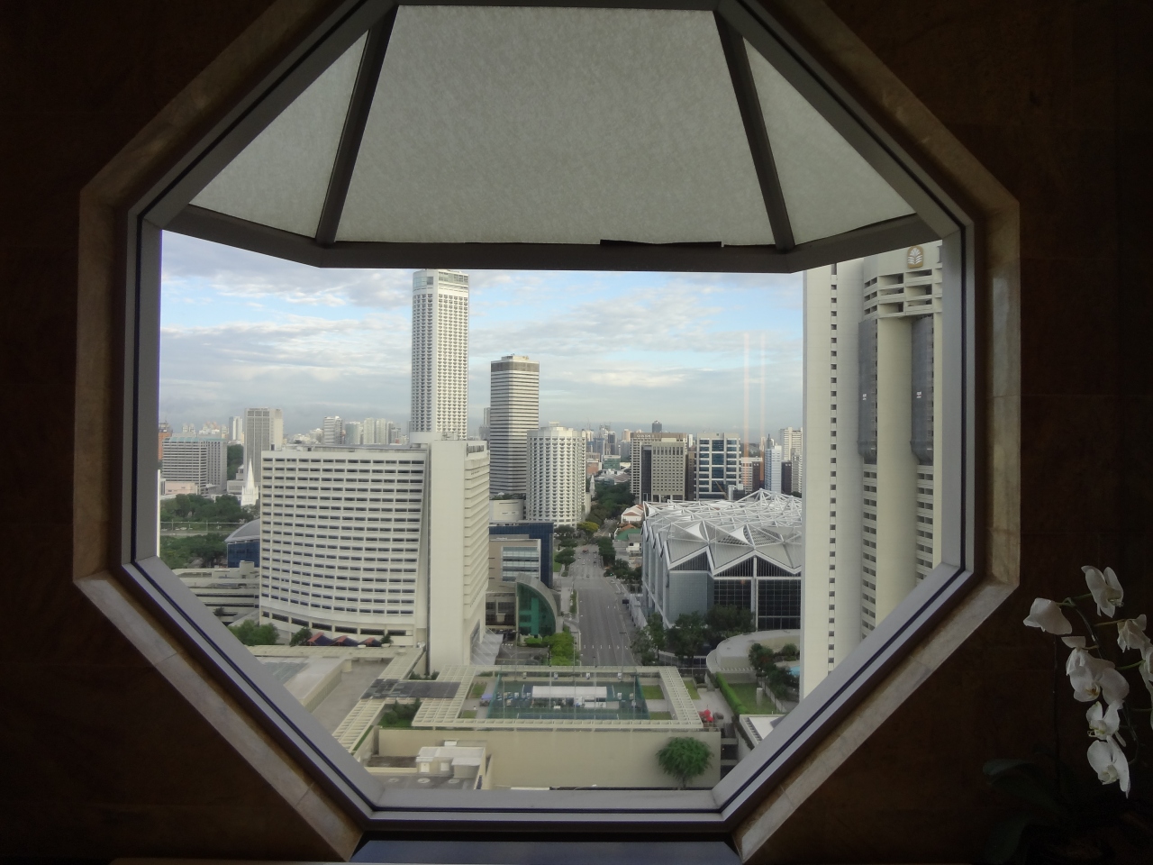 ホテルからの景色が大変素晴らしい。マリーナ・ベイ・サンズをはじめとする高層建築群、マリーナ湾、多くの船が行き交うシンガポール海峡など一望できる。
