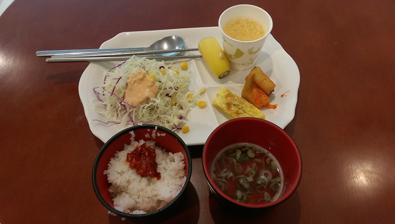 内容はライス・スープ・サラダ・キムチ・チンジャ・卵焼き・トースト・ジュースなどですが、昔より品数が減ったような気がしました。