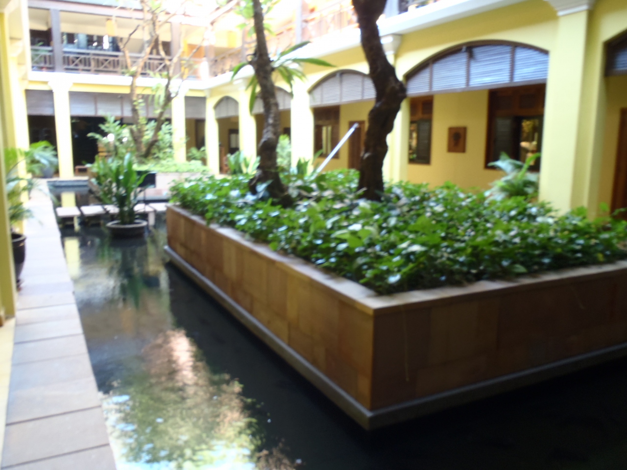 2015年6月1日~4日までお世話になりました。良い所:●空港⇔ホテルの送迎は行きも帰りもホテルに頼みました。片道一台22ドルです。高い!でも快適で安心です。冷たいおしぼり付です。●閑散期のせいかお部屋を18時まで使わせてくれました。●うるさい団体客がいませんでした。白人が多いです。●朝食は6時からバイキング形式です。建物の中の方が涼しくて良いです。外人は暑いのに外の席で食べていました。スパークリングワインあり、エッグスタンドあり、きれいなオムレツを作って持ってきてくれます。小さいので女性でも食べられます。ヌードルスタンドもありましたが麺が柔らかくて残念でした。特筆すべきはチーズです。朝から贅沢にチーズの盛り合わせをお皿に作り焼いたパンにはさんでハムと一緒に頂きました。あと、マンゴージャムがおいしいです。●ホテルのスパはセール中でクメールマッサージなるものが2人で68ドルでした。タオルの上から施術するドライマッサージです。4-5ドルプラスするとオイルマッサージへの変更もできます。スパは個室で貴重品入れがあるので財布と携帯くらいは持って行けます。こちらのスパは高評価みたいですね。強めのマッサージがとても気持ち良かったです。●ホテルの入り口には親切なドアボーイが数人いて△△レストランに行く、と言うとその場で電話をしてくれたりします。何か質問すると一生懸命答えてくれます。そして外出から帰ると毎回冷たいおしぼりをくれます。トゥクトゥクも呼んでくれます。日本人のスタッフさんはいませんでした。●ホテルの前にトゥクトゥクが数台常駐していますが、トゥクトゥクナンバー4番のパーさんがお気に入りです。(このナンバーが大事らしい。)なぜなら彼は寡黙で余計な押し売りトークを一切しないからです。滞在中ずっとパーさんを指名してレストランとロリュオス遺跡に連れて行ってもらいました。一度だけなぜかパーさんがいなくて違う人のトゥクトゥクに乗ったらしつこく営業してきてうざかったです。しかも夕食後、待ち合わせ場所にいなくて困りました。家に帰ってしまったそうですw。大体どこへ行くにも2ドルです。歩いて行ったのは斜め前に建つラッフルズだけでした。●お部屋は特別広いわけではありませんが十分です。ツインベッドのお部屋でした。NHKが映ります。お掃除は日に2回、常に清潔です。スリッパあり、バスタブあり、バスローブあり、金庫あり、ドライヤーあり、ボディローションあり、ベープみたいな電気の蚊取りマットあり、最低限のものは揃っていますがコンディショナーと歯みがきセットは持って行ったほうが良いです。広いバルコニー付ですが暑くて全く使いませんでした。ハンカチくらいは外から見えないように干せるので洗濯バサミを持っていくと便利です。冷房は良く効きます。バスタブはお湯を張るとすぐにたまるので注意です。シャワージェルが良い香りでした。毎日飲料水をくれるので冷蔵庫で冷やして観光に持って行きました。携帯とデジカメの充電器がそのままコンセントに刺して使えました。●レストランが2カ所(朝食会場とディナー営業のフレンチレストラン)、バーが1か所で5時からハッピーアワー、ドリンク半額です。毎日ハッピーアワーでビールを飲んでから街へ夕食に繰り出しました。ハッピーアワーでは毎回短い野菜スティックをサービスで出してくれるのですが野菜がみずみずしくて驚きました。結局フレンチレストランは行きませんでしたが単品メニューも多くありました。●スーベニアショップは高いけど中へ入ると冷房が効いています。●プールは入りませんでしたが、いつも外人が数人いる程度でガラガラでした。暑すぎて部屋にいる方が涼しいのです。●フロントのお兄さんお姉さん→帰る日にフライト状況をチェックしてもらいました。結局予約していた便が欠航になったのですが優しいお兄さん達が親身になってあちこち連絡を取ってくれました。これは別途クチコミしてます。あと1ドル札がなくなってもフロントでくずしてくれます。    小さい事ですがイマイチな所:●メリディアンのような大型リゾートではありません。こじんまりとしたホテルなので館内探検もできません。そしてフロント回り、ロビー回り、廊下、レストラン内、とにかく館内が全体的に暗いのです。昼間でも薄暗く、夜も外から帰ってくると部屋に着くまでが暗い。そこがホテルの特徴でもあり人気の理由なのでしょう。良く言うと植民地時代のセレブみたいでノスタルジックですが、私は好みが分かれると思いました。静かだったので上級者がプールサイドでのんびりするには良いと思いました。お部屋の中は普通の照明ですので大丈夫ですよ。
