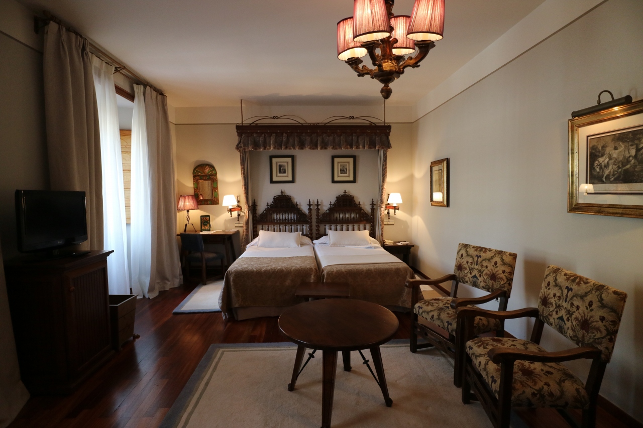 大聖堂の隣、オブラドイロ広場に面しています。 ツアーで利用しました。建物は昔のままですが、客室はとてもきれいです。内部に4箇所のパテイオやチャペルがあり、客室のまでは迷路感があります。4階(地上の4階上)の部屋でしたがエレベータの数は多く待ち時間はほとんどありませんでした。地下1階のメインダイニングは豪華で、大人の雰囲気〔ほとんどが年配の個人客〕でした。部屋の鍵はカードキーではなく古いタイプ、2回転しないと閉まらないちょっと厄介なものでした。