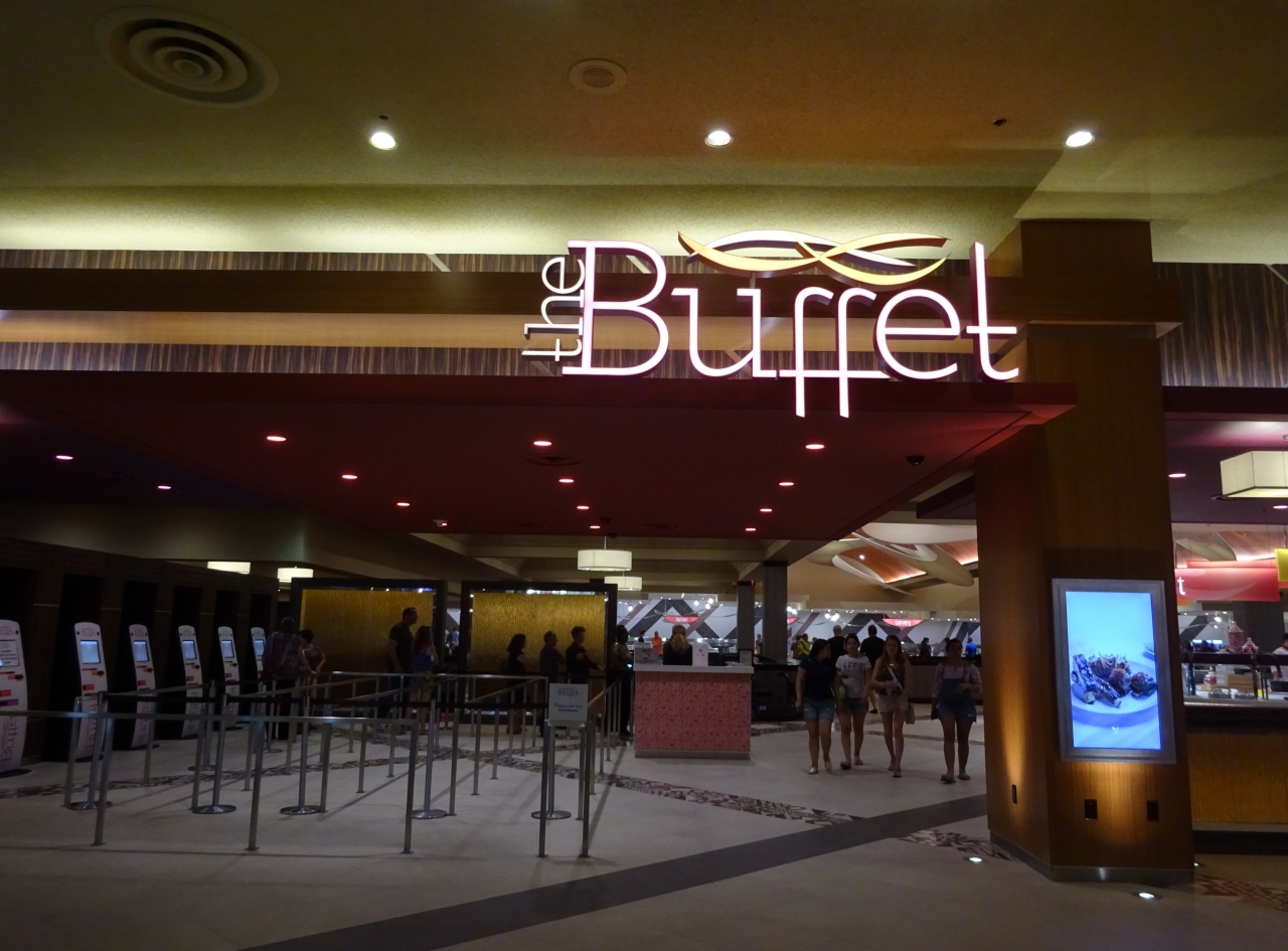 チケットは自動券売機で購入。もちろん全て英語ですが、簡単なので英語がわからなくても、少々読めれば大丈夫です。値段は食事のみで13ドル位だったと思います。ドリンクは飲み放題です。チケットを購入したら、係りの人が席に案内してくれるので専用のレーンで待ちます。後は普通のバイキングと同じ。好きなものを好きなだけ食べるだけ。