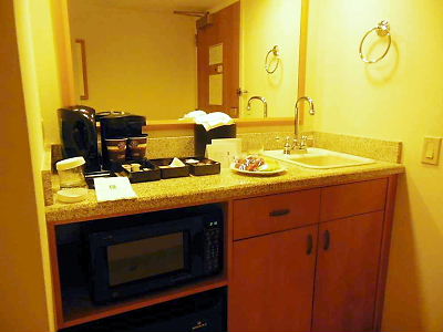 キッチンは小さな流し台があり、冷蔵庫・電子レンジ・コーヒーメーカーがありました。