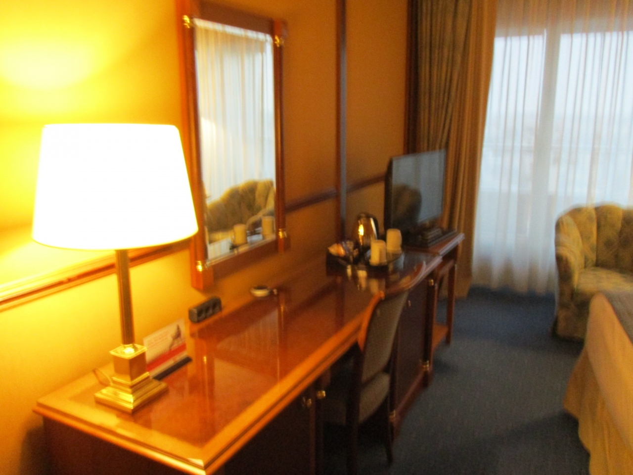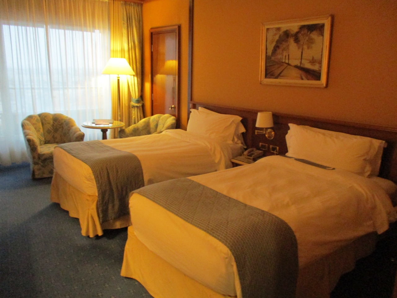 泊まった客室はゆったりとしたツインで、白い天井、黄土色の壁、モスグリーンの絨毯に各部屋にはベランダがついており外気を感じることができました。